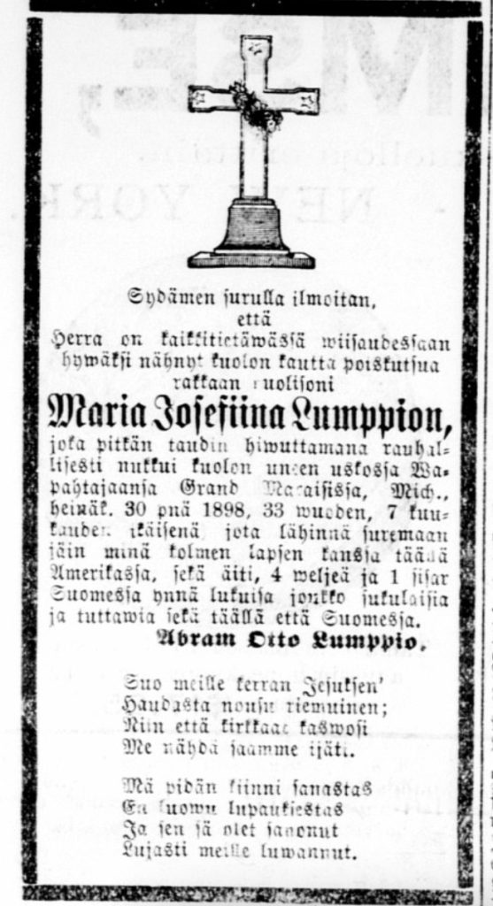 Kaustisella, Juoperin talossa vuonna 1866 syntynyt Aaprami Otto Joonaanpoika Lumppio palasi Suomeen Amerikasta vuosisadan vaihteessa lastensa kanssa. Hänen vaimonsa, Maria Josefiina Puusaari oli menehtynyt pitkän sairauden jälkeen 30.7.1898 Michiganin Grand Maraisissa, Lake Superiorin rannalla.