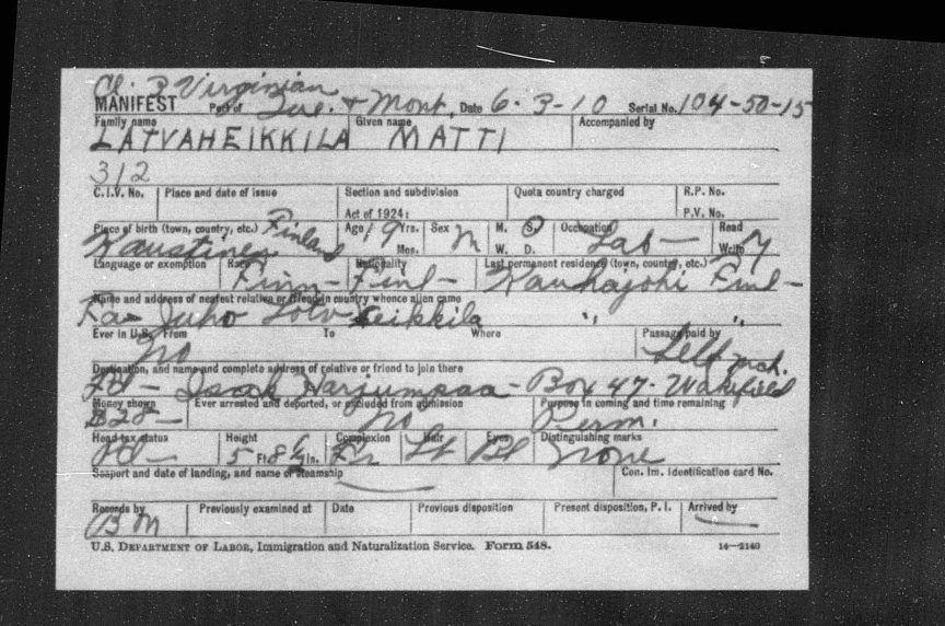 Äiti Alma Lumppio lähti Kaustiselta siirtolaiseksi Amerikkaan tammikuussa 1894 ja palasi sieltä uuden perheen kanssa Kauhajoelle kesäksi 1900. On epäselvää, oliko Matti Benjamin tuolla Montanassa mukana, mutta aikuiseksi kasvettuaan hän lähti Kauhajoelta siirtolaiseksi vuonna 1910. Siirtolaispapereissa ei mainita hänen olleen Amerikassa aikaisemmin, joten ehkä hän on ollut liian pieni lähtemään ja jäänytkin Suomeen sukulaisten hoiviin. Quebeciin 19-vuotiaana suunnatessaan, mukana oli muita kauhajokisia ja päämäärä oli Michiganin Wakefield. Latvaheikkilä-sukunimeä uuden kotitilansa mukaan käyttänyt Matti Benjamin matkusti kesäkuussa 1910 Virginian-laivalla ja Amerikan pään tuttavaksi hän on merkinnyt Isak Harjunpään.