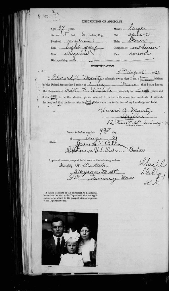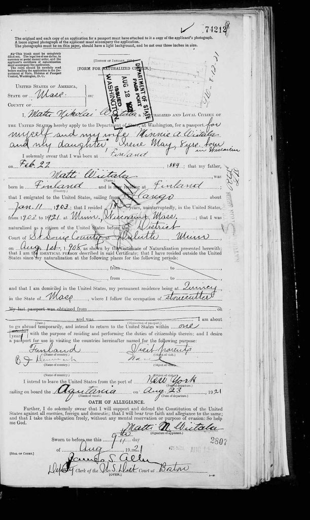 Matti Nikolai ”Nick” Viitala haki passia Massachusettsissa elokuussa 1921. Hän oli saapunut Amerikkaan jo miltei parikymmentä vuotta aikaisemmin, tammikuun 11. päivänä 1903. Nyt Matti Nikolai valmistautui Suomen-vierailulle perheensä kanssa ja kirjoitti passihakemukseensa menevänsä vierailemaan vanhempiensa luokse. Matka tapahtuisi Aquitania-laivalla elokuun 23.päivänä New Yorkista.