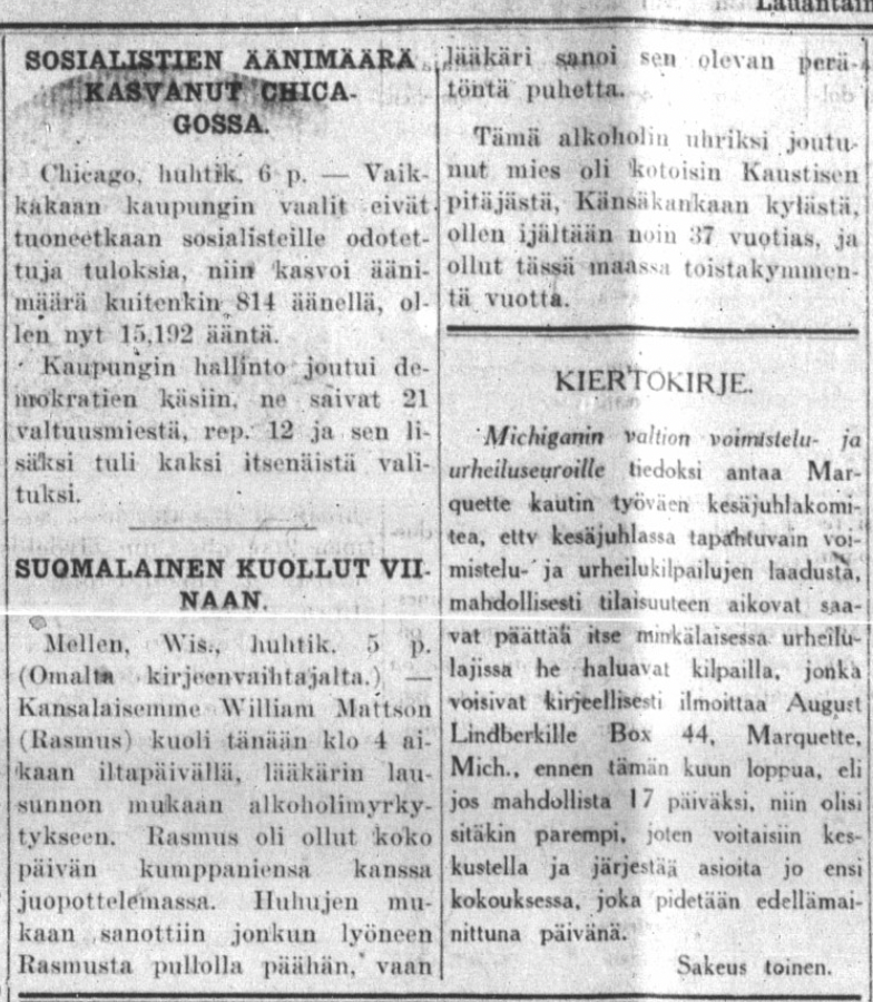 Kansalaisemme William Mattson (Rasmus) kuoli tänään kello 4 iltapäivällä, lääkärin lausunnon mukaan alkoholimyrkytykseen. Rasmus oli ollut koko päivän kumppaniensa kanssa juopottelemassa. Huhujen mukaan sanottiin jonkun lyöneen Rasmusta pullolla päähän, vaan lääkäri sanoi sen olleen perätöntä puhetta.