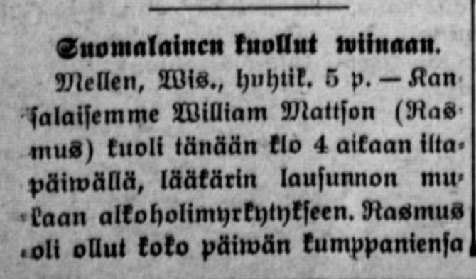 Kansalaisemme William Mattson (Rasmus) kuoli tänään kello 4 iltapäivällä, lääkärin lausunnon mukaan alkoholimyrkytykseen. Rasmus oli ollut koko päivän kumppaniensa kanssa juopottelemassa. Huhujen mukaan sanottiin jonkun lyöneen Rasmusta pullolla päähän, vaan lääkäri sanoi sen olleen perätöntä puhetta.